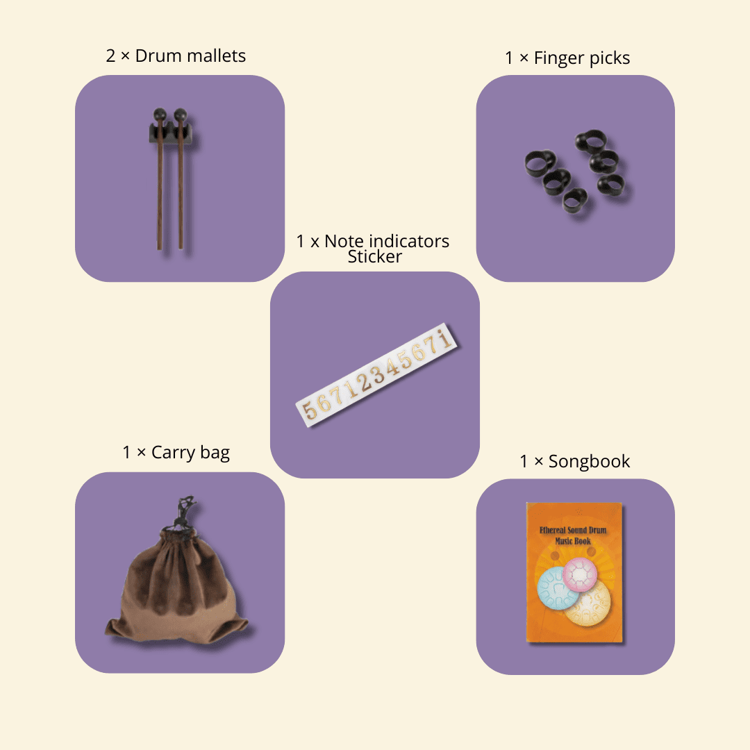 Includes the 6-inch Steel Drum, two mallets, carry bag, music stickers, and beginner's songbook.